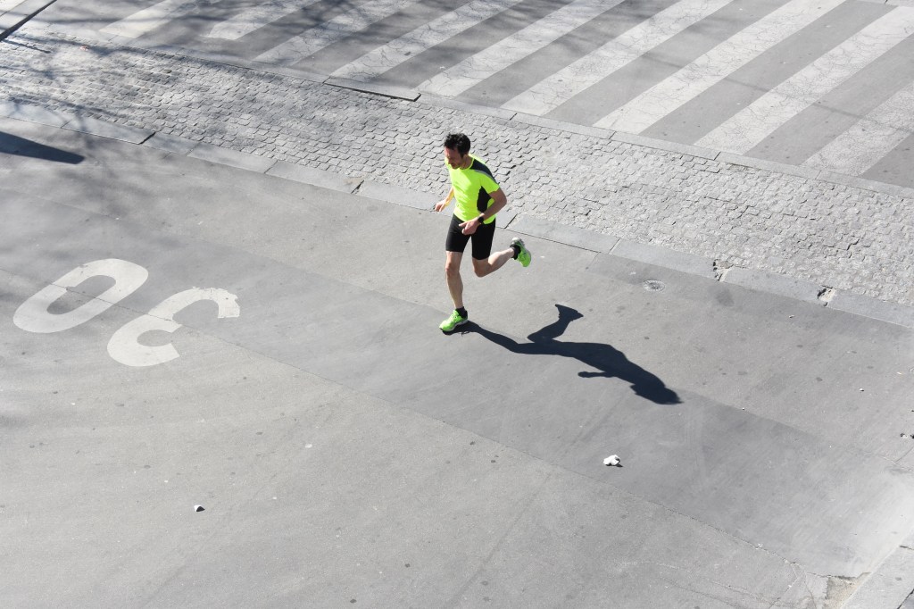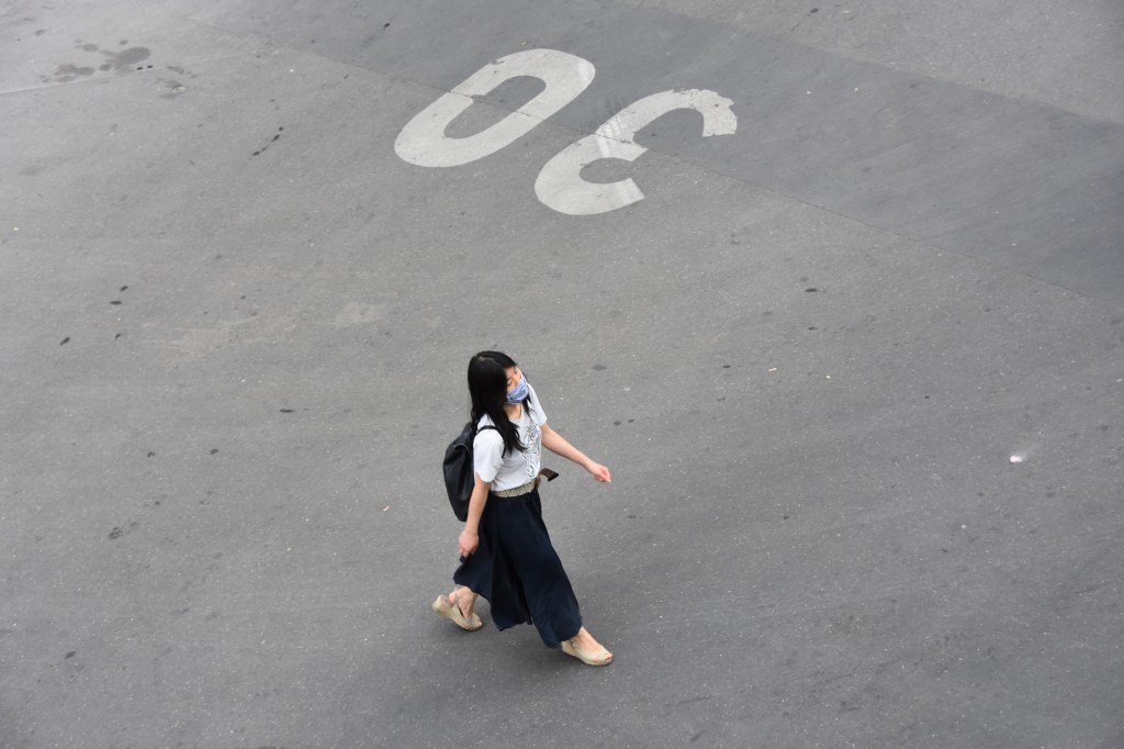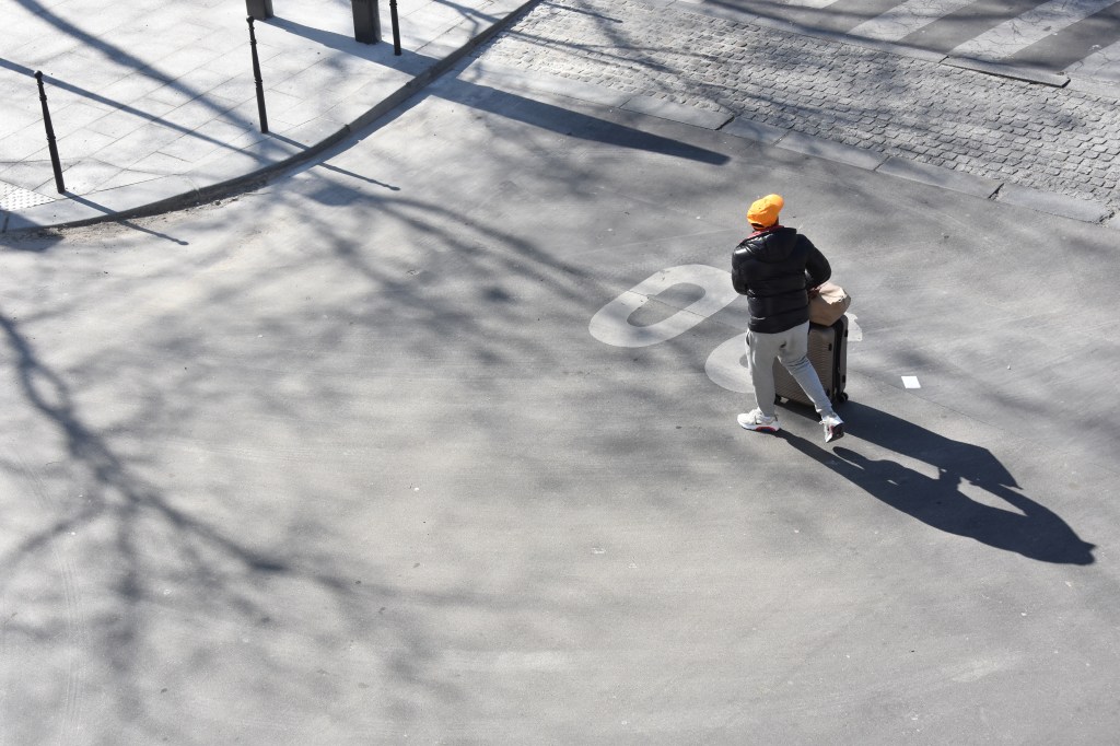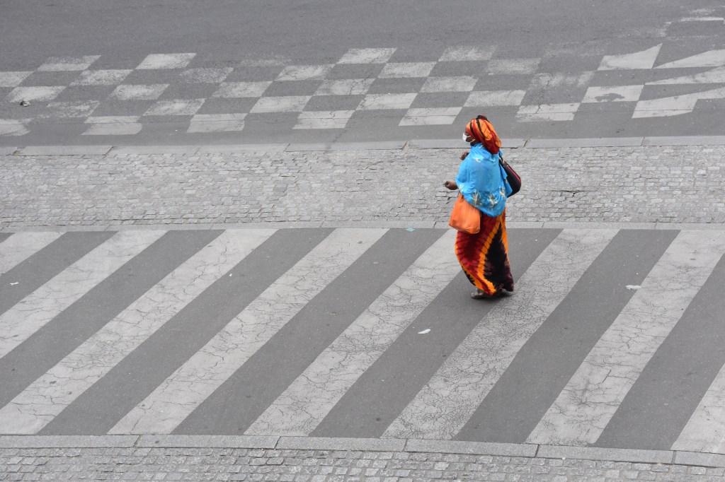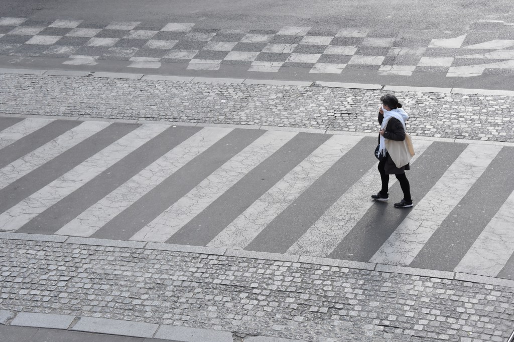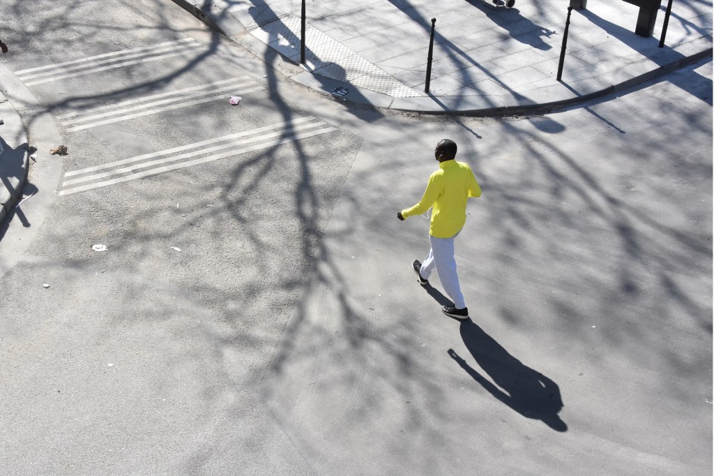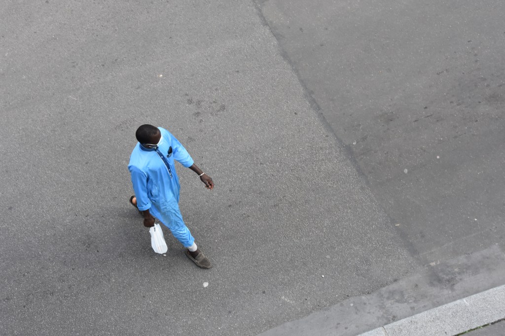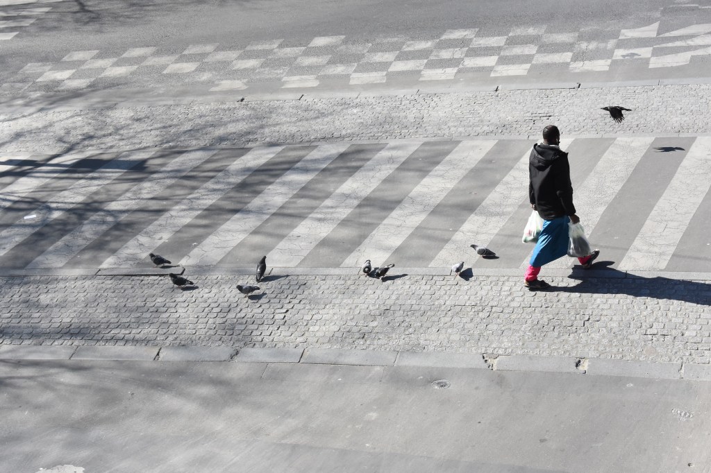 Je regarde à la fenêtre. Dans ce quartier habituellement très animé, peu de monde dans la rue. Les gens sortent prudemment et rapidement faire les courses. Je les vois désorientés, perdus, ne sachant pas comment s’y prendre pour garder les distances, pour se protéger, pour réfréner les gestes quotidiens spontanés. Surtout pas toucher. Je les photographie dans cette situation irréelle, étrange.
